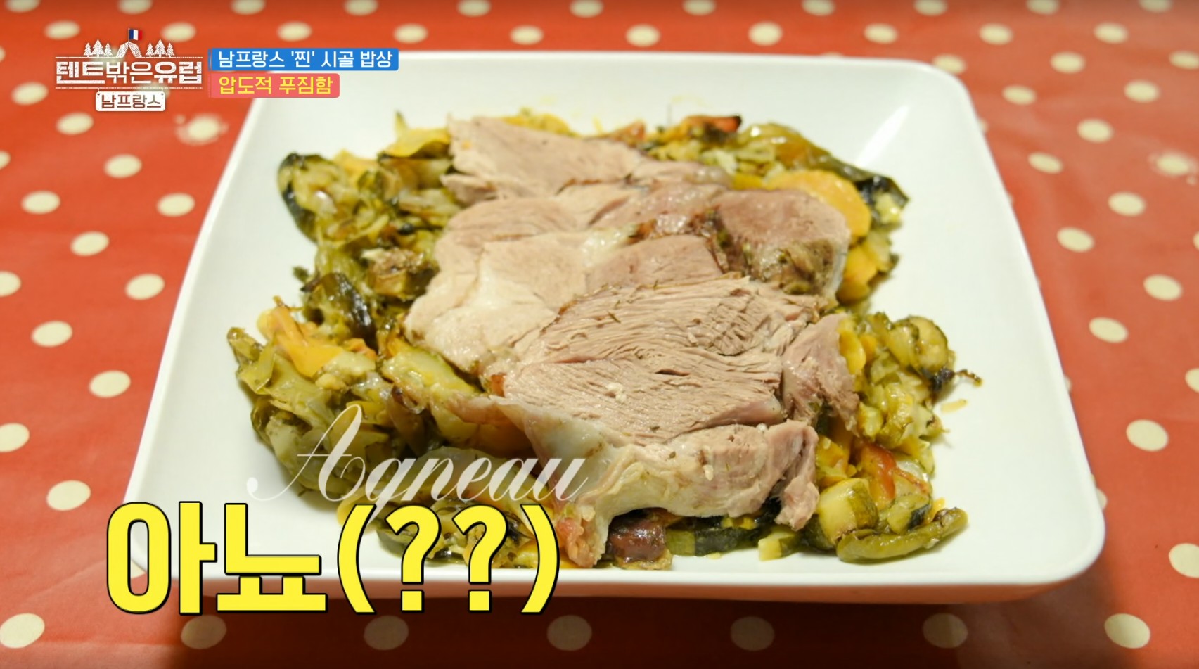• 방송에서 나온 두 번째 새로운 음식 아뇨(Agneau)는 족발처럼 생긴 고기가 야채 위에 올려진 음식으로, 어린 양고기를 허브로 간한 다음 2시간가량 오븐에서 익힌 부드러운 양고기 로스트(roast) 요리입니다.