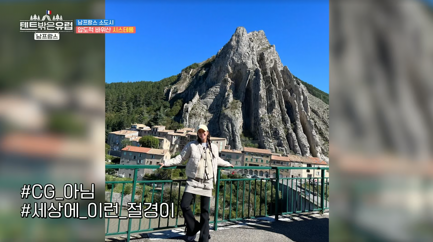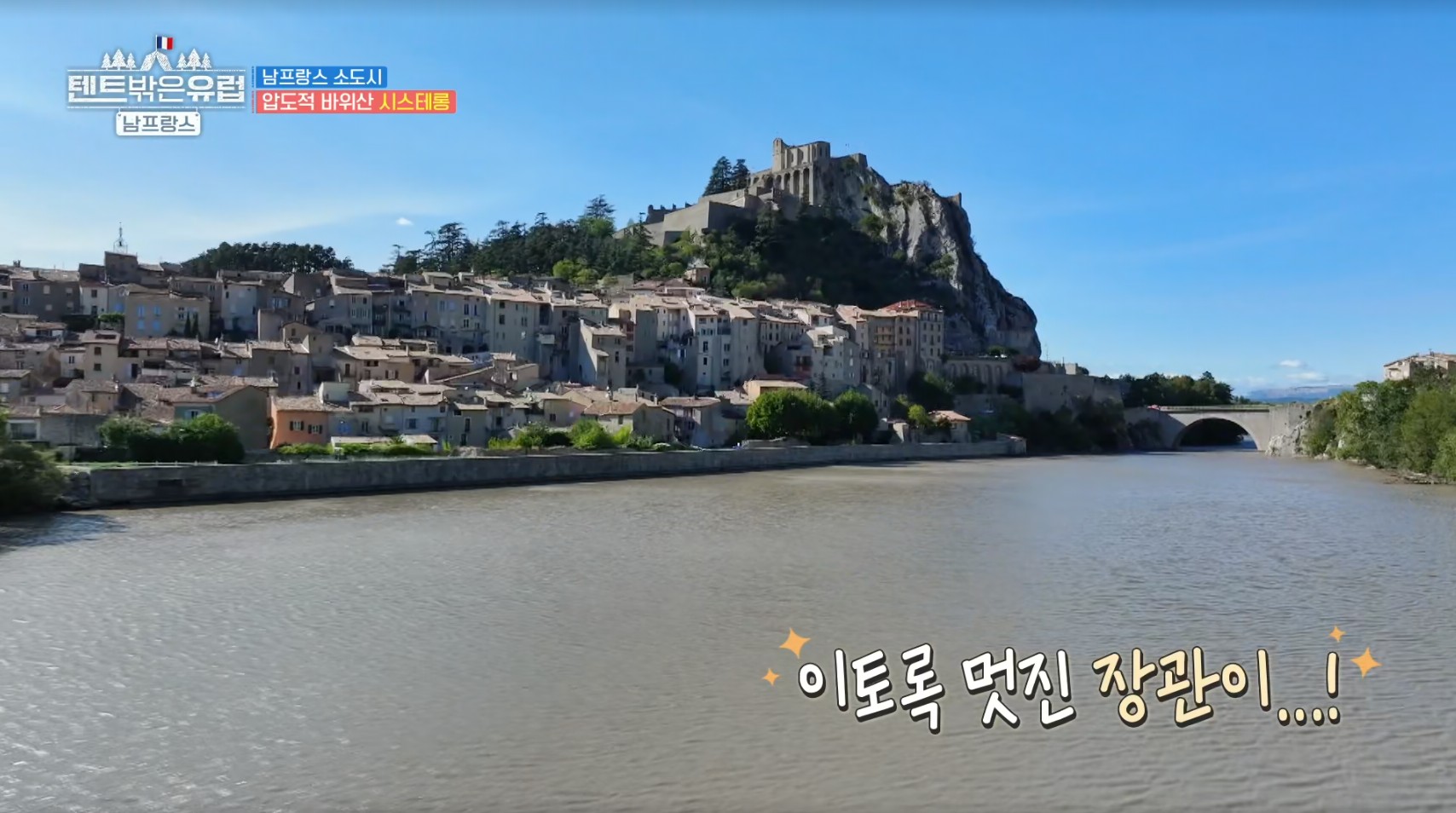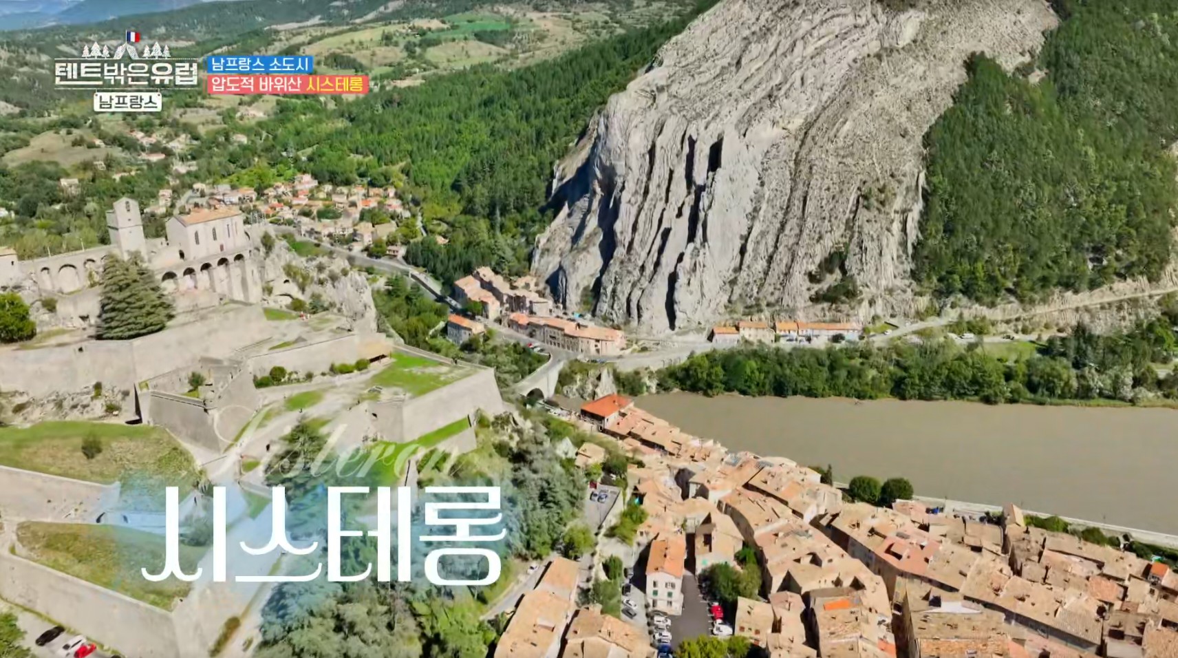 남프랑스를 렌터카로 캠핑 용품을 싣고 자유롭게 여행하는 이번 시즌에서는 숨겨진 보석 같은 장소가 아주 많이 나오는데, 지난 포스팅에서 소개해드린 라벤더 밭 발랑솔(Valensole)을 지나서 출연진들의 시선을 단박에 사로잡은 마을이 등장합니다. 강을 끼고 달리다 발견한 절벽을 마주한 마을에 모두들 마음을 빼앗겨 들러버리고 마는, 시스테롱(Sisteron)입니다.