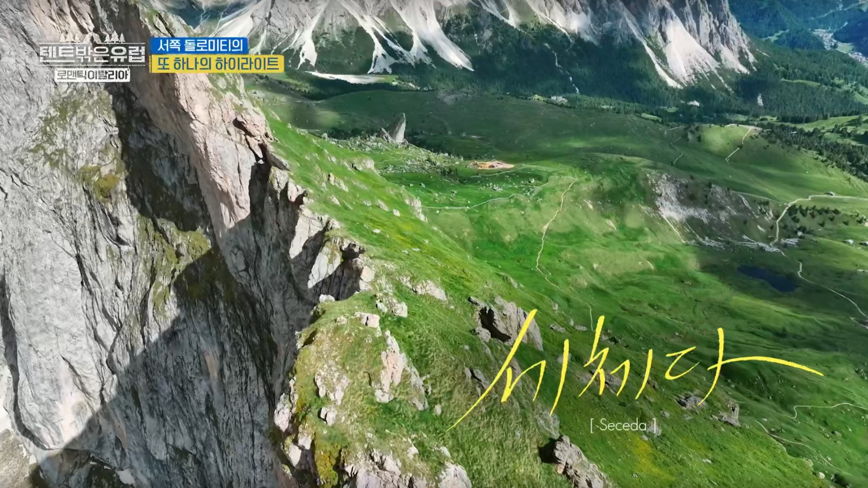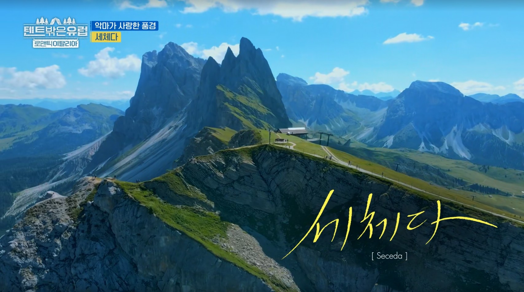 <텐트 밖은 유럽 - 로맨틱 이탈리아> 8화에서는 서쪽 돌로미티의 두 번째 장소, 거칠게 솟아난 초록빛 들산으로 유명한 인생샷 명소 세체다(Seceda)로 갑니다. 두 개의 판이 만나 융기한 뾰족한 봉우리와 그 옆의 완만한 초원으로 '뾰족하면서도 완만한' 세체다는, 옆면을 따라 끝없이 펼쳐진 절벽의 위용이 남다릅니다. 특히 뾰족한 봉우리는 마치 악마가 할퀴고 떠난 듯 강렬한 모양을 가지고 있어 '악마가 사랑한 풍경'이라 불립니다.