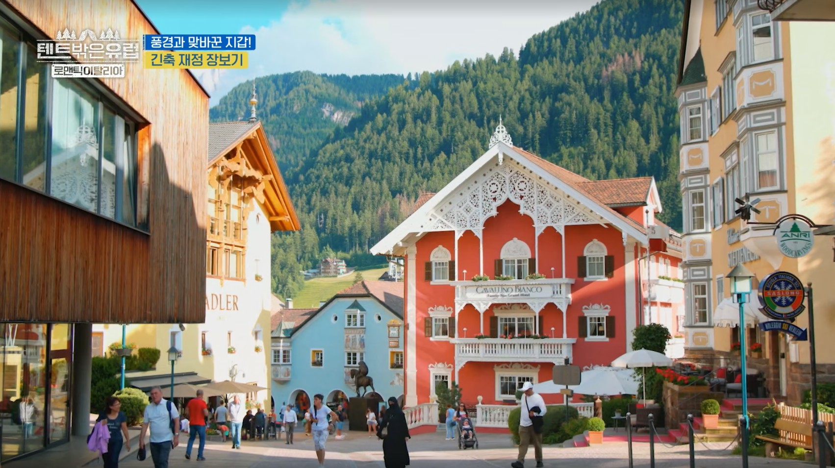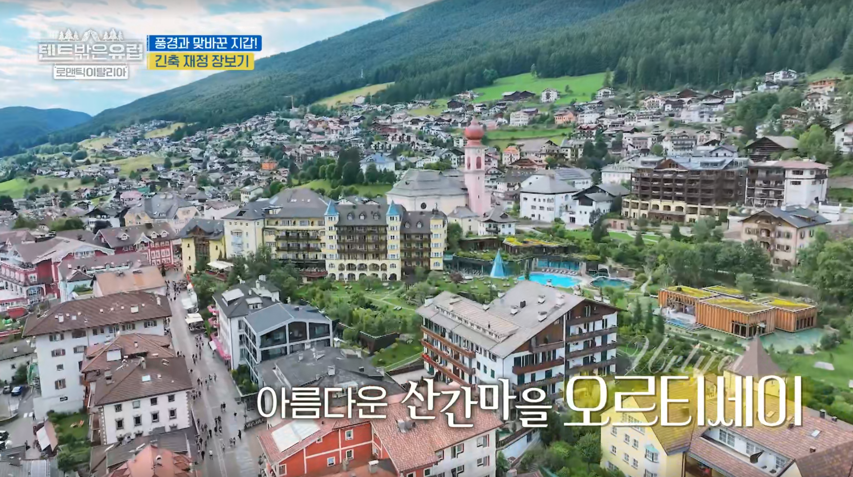 잠시 장을 보기 위해 들렀으나 알록달록하고 동화 같은 마을의 모습에 돌아다니고 싶은 마음이 들 정도였다고 합니다. 알프스 산맥의 마을 느낌이 물씬 나는 오르티세이(Ortisei)는, 사실 <텐트 밖은 유럽> 출연진들이 방문한 여러 장소를 방문하기 위한 거점 마을로 관광객들이 아주 많습니다.